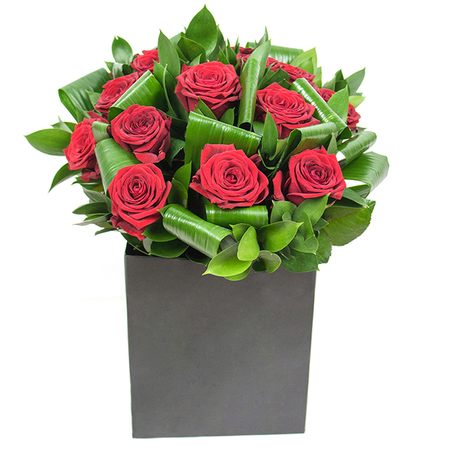 Discover the perfect blend of passion and sophistication with our signature arrangement. Stunning red roses harmonize with aspidistra leaves and ruscus, creating an evocative bouquet that transforms any space into a haven of elegance.
